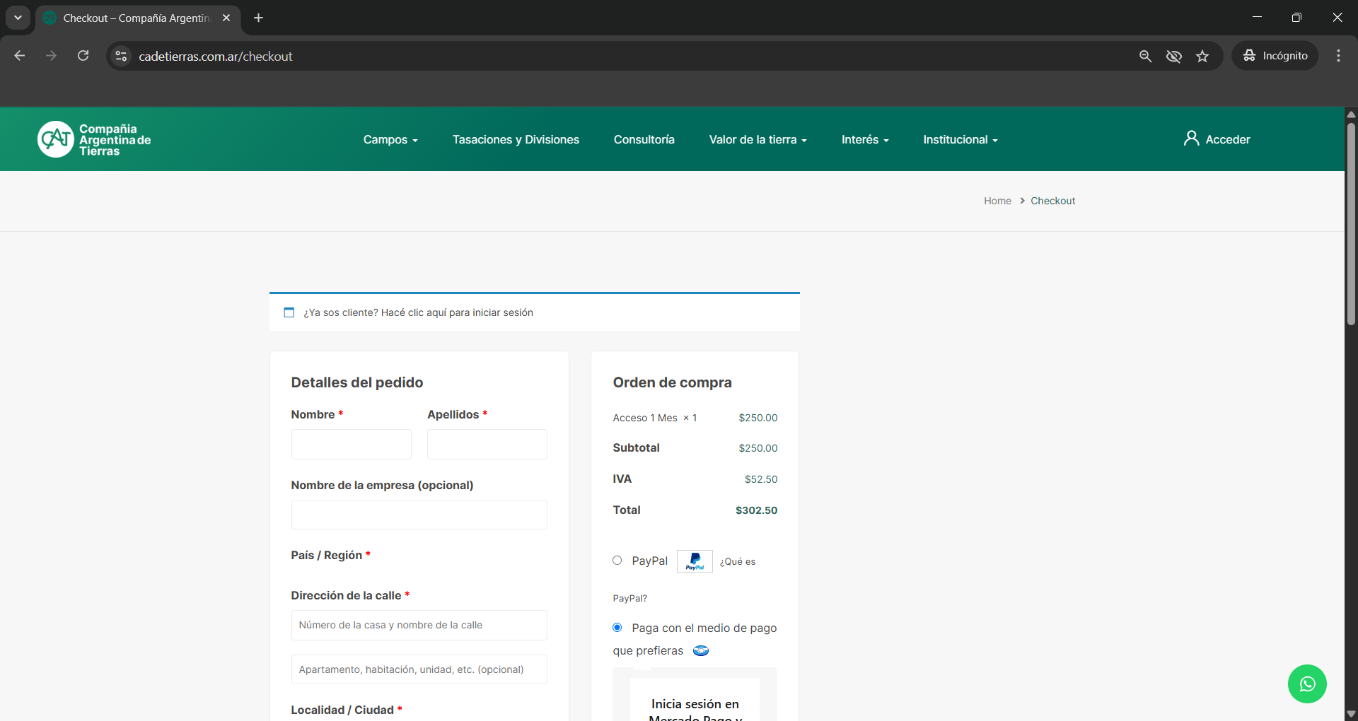 Accederá, de esta manera, al Checkout donde debe ingresar los datos requeridos para continuar con la compra.