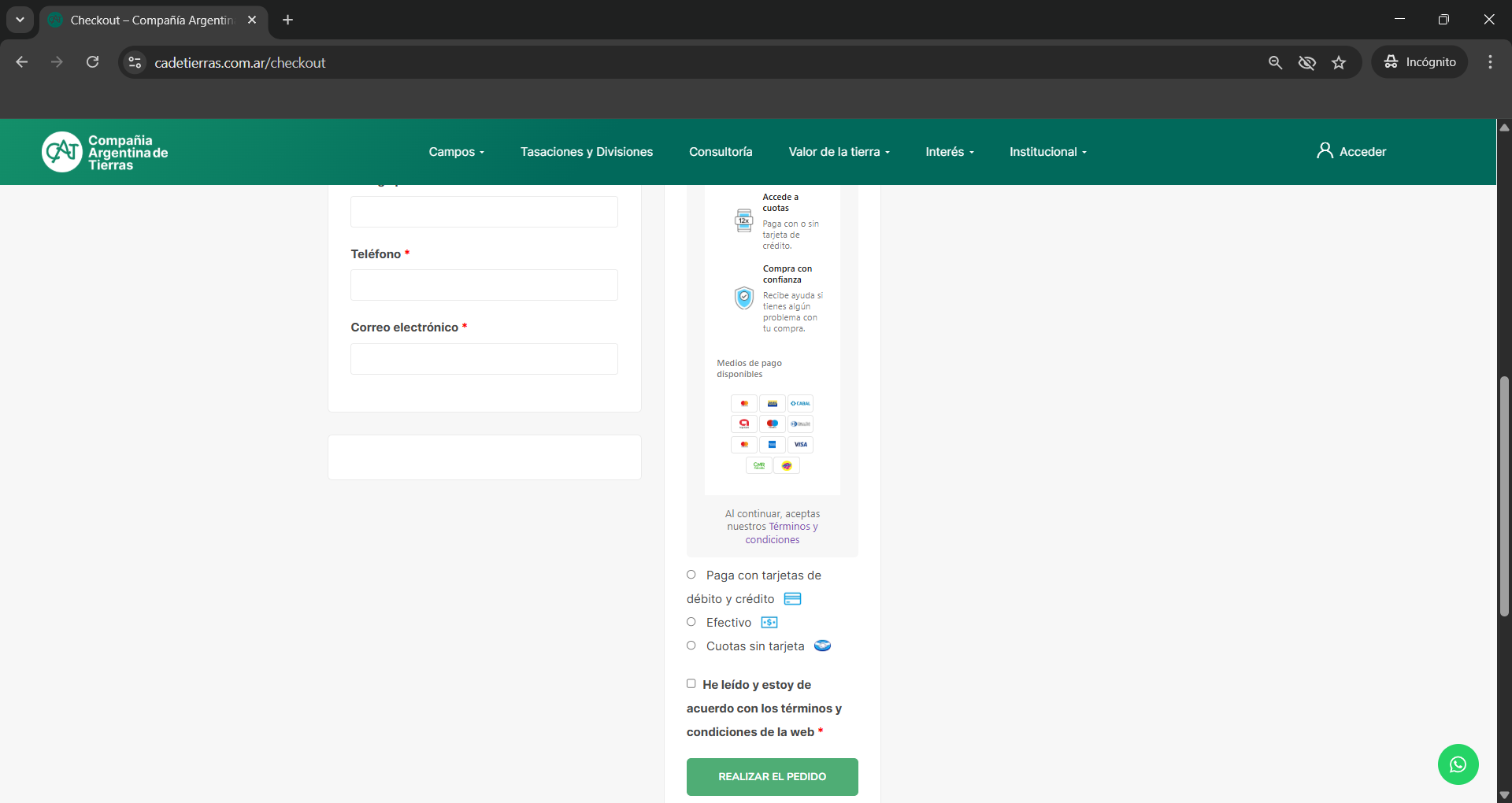 Y luego de corroborar su pedido, debe seleccionar un método de pago y aceptar los Términos y Condiciones para continuar.