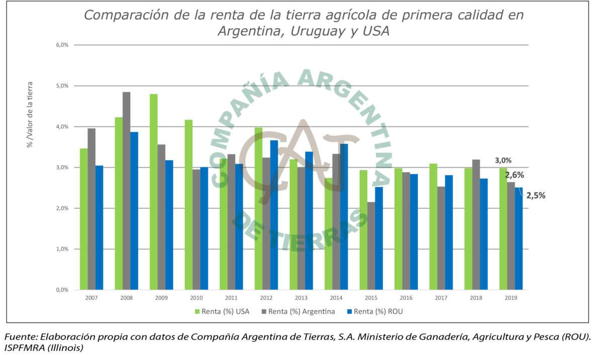 04/12/2019: Gráficos: Comparación del valor y la renta de la tierra agrícola de primera calidad en Argentina, ROU y U.S.A.