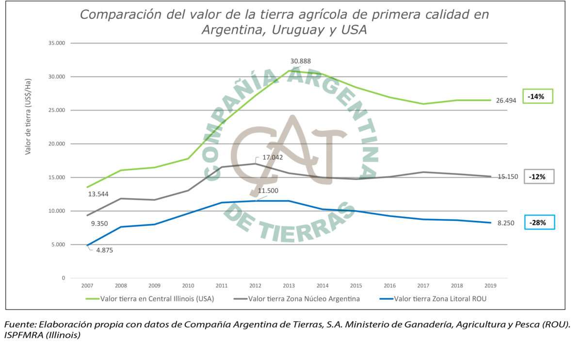 En otro enfoque, es interesante observar la caída producida en los precios de la tierra, a partir de la reducción del precio de las commodities agrícolas, en donde Argentina y USA tienen caídas similares, pero en el Uruguay los precios caen desde más arriba, generados por una sobrevaluación impuesta por una sobre en un espacio reducido demanda (Fondos de inversión, argentinos y extranjeros europeos).